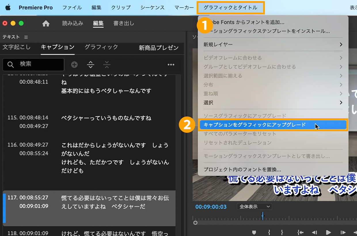 キャプションにアニメーションやエフェクトを入れたい場合、キャプションをグラフィックにアップグレードしましょう。C1トラックの「サブタイトル」に並んでいるキャプションを全て選択します。①「グラフィックとタイトル」メニューをクリック。②「キャプションをグラフィックにアップグレード」を選択するとV3トラックにキャプションが自動生成されます。また、作成したキャプションのスタイルを他のキャプションにも使用したい場合は、トラックスタイル>スタイルを作成を選択すると、スタイルを保存できます。