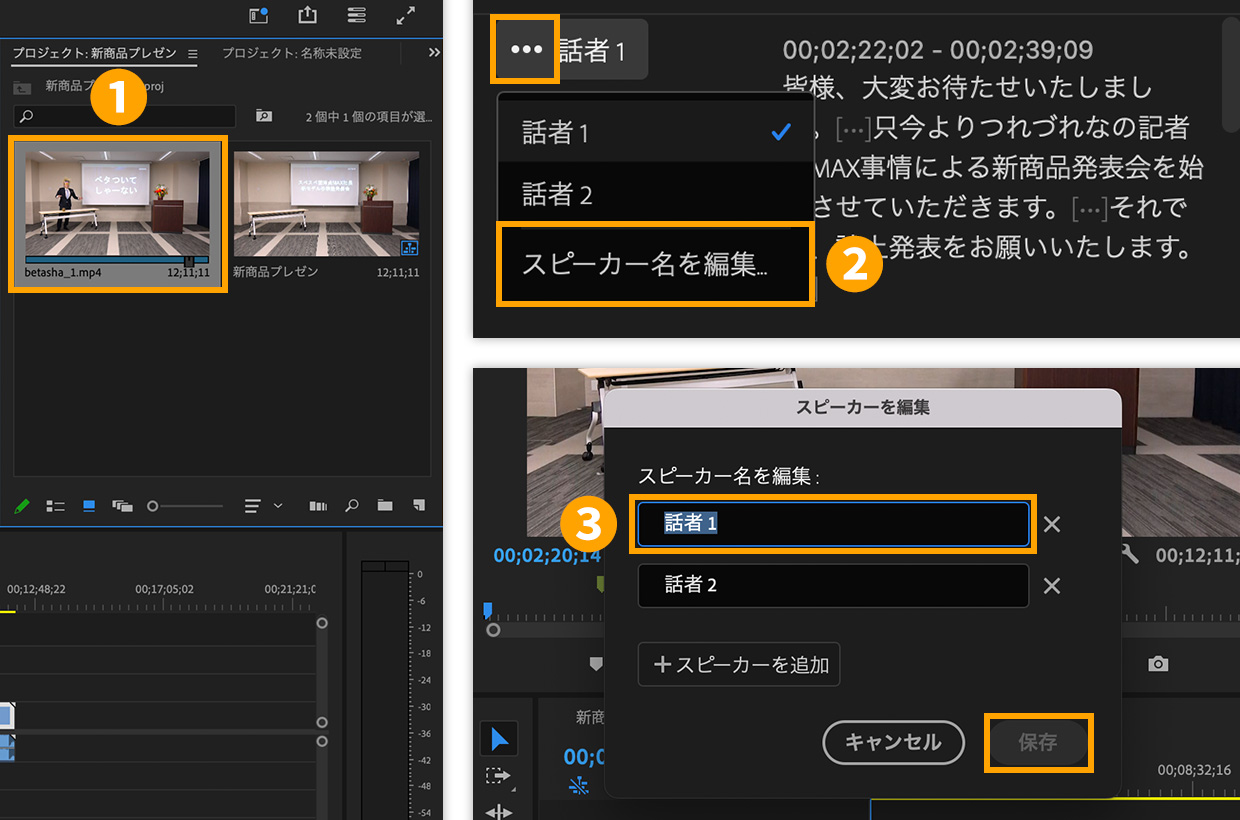 はじめに、ウィンドウ>ワークスペース>文字起こしベースの編集に設定されていることを確認しましょう。文字起こしパネルに、自動で文字起こしされたテキストが表示されます。話者が複数名いる場合は、話者の識別も自動で行われます。編集を効率化するために、話者の名前を変更しましょう 。①プロジェクトパネルのソースクリップをダブルクリック。②「話者1」の左にある「…」をクリックし、「スピーカー名を編集」を選択。③ダイアログボックスが表示されたら、任意の名前を入力し「保存」をクリック。