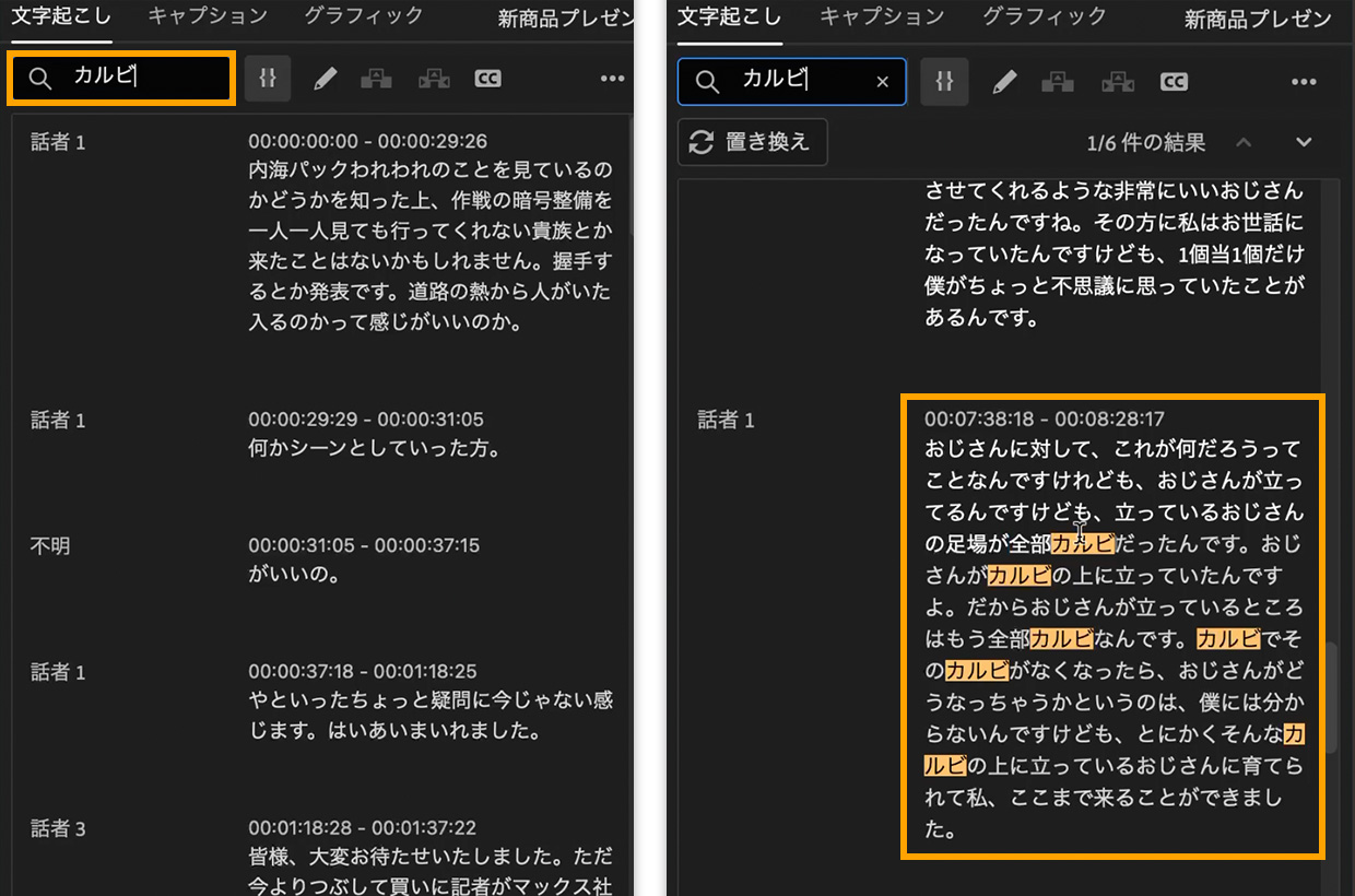 検索ウィンドウに探したいシーンのキーワード(例:「カルビ」)を入力すると該当箇所に移動することができます。※文字起こしのテキストはサンプルと異なる場合がございます。