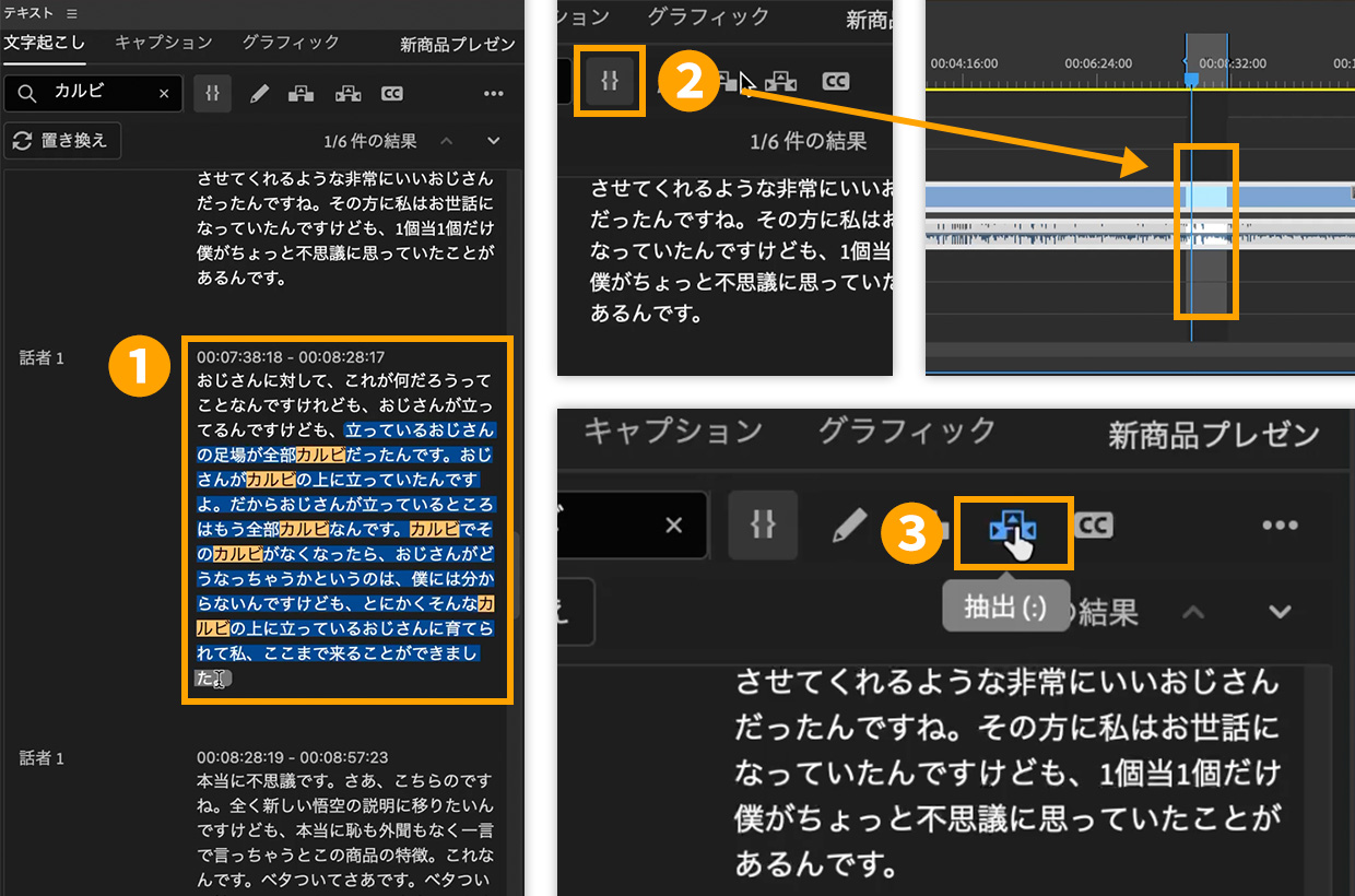 ①カットしたいシーンのテキストの始まりから終わりまでを選択。②「インとアウトポイントを自動設定」をオンにしておくことでタイムライン上でも範囲が選択されます。③「抽出(:)」をクリックするか、Delete/Backspaceキーで不要な部分を削除します。同時にタイムラインの映像の選択部分もリップル削除されることを確認しましょう。