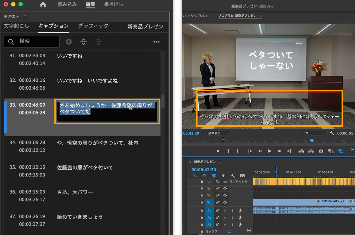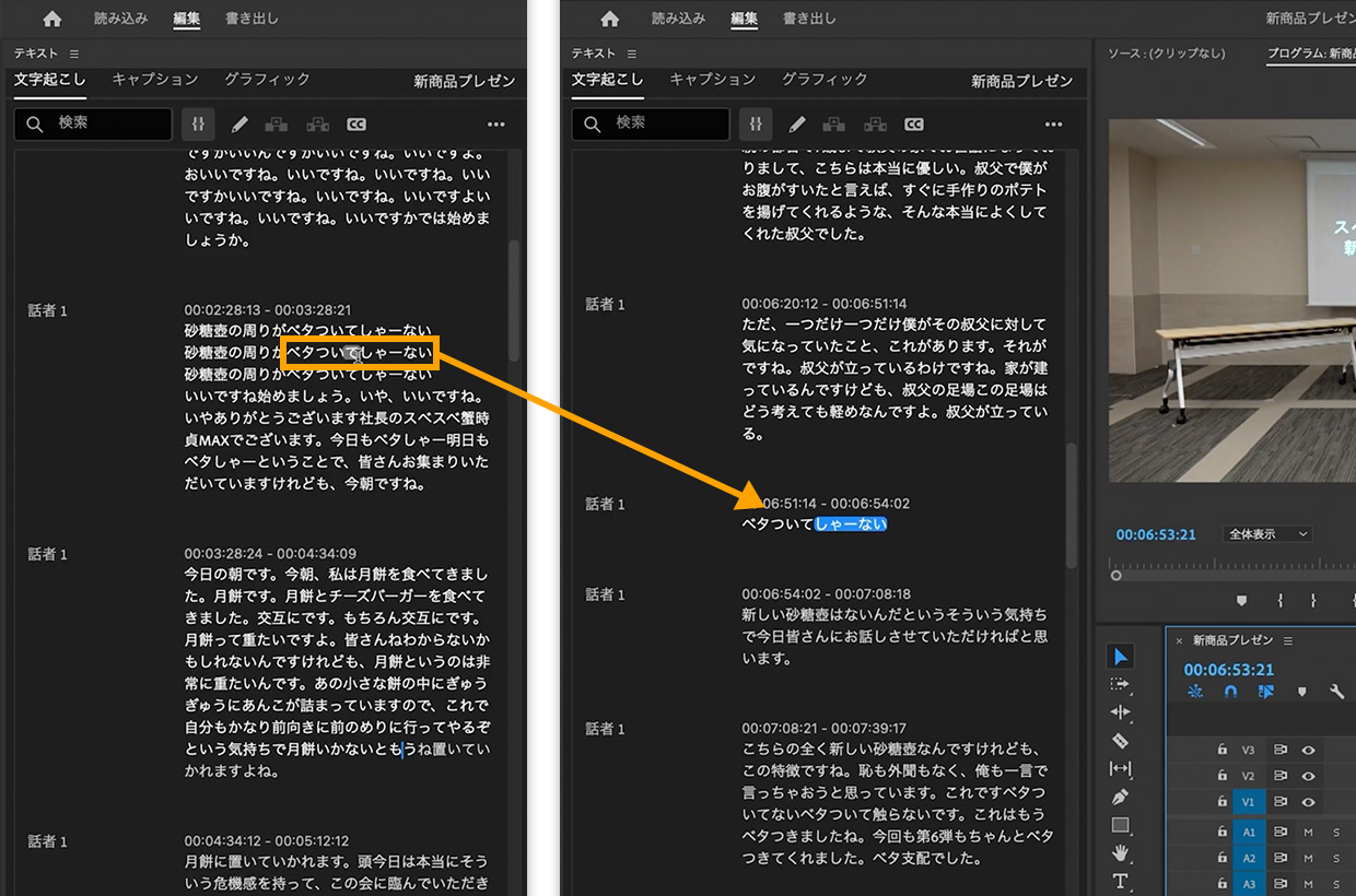キャプションパネルの修正したい部分をダブルクリックすると編集モードになります。単語の修正や改行、不要な空白をつめるなどの調整を行います。※プログラムモニターで直接修正することも可能です。