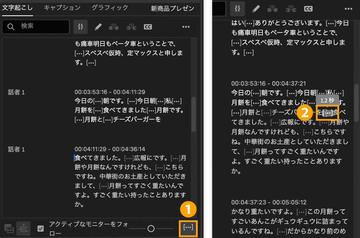 ①文字起こしタブの右下にある[…]アイコンをクリックすることで空白(無音)部分が[…]で表示されます。②カットしたい場所の[…]をクリックして選択し、Deleteキーをクリックして削除することで簡単にカット編集が行えます。