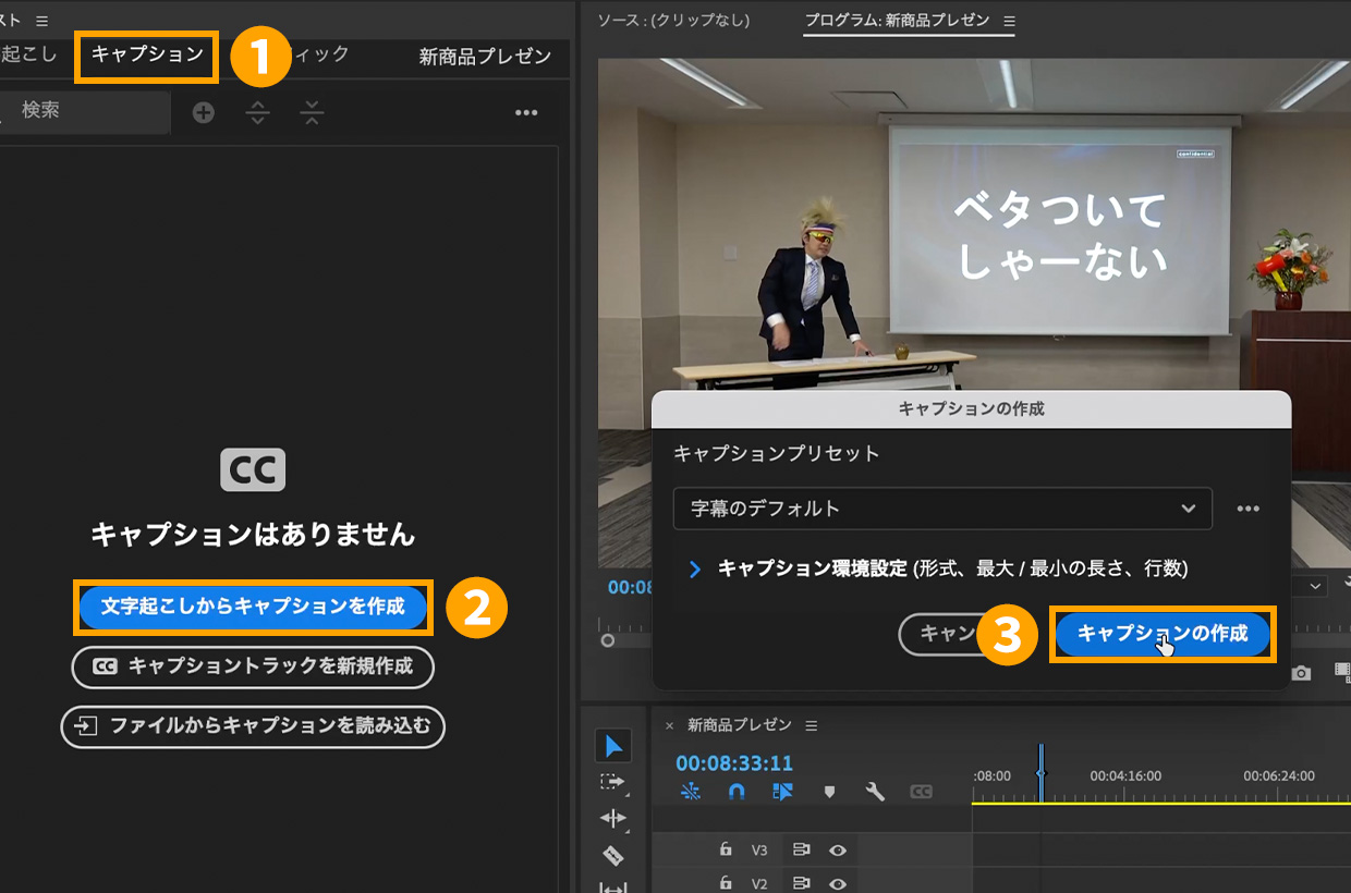 ①キャプションパネルを開き、②「文字起こしからキャプションを作成」をクリック。③キャプション環境設定で最大文字数、最短のデュレーション、行数などを設定して「キャプションの作成」をクリックすると、画面にキャプションとして表示されます。