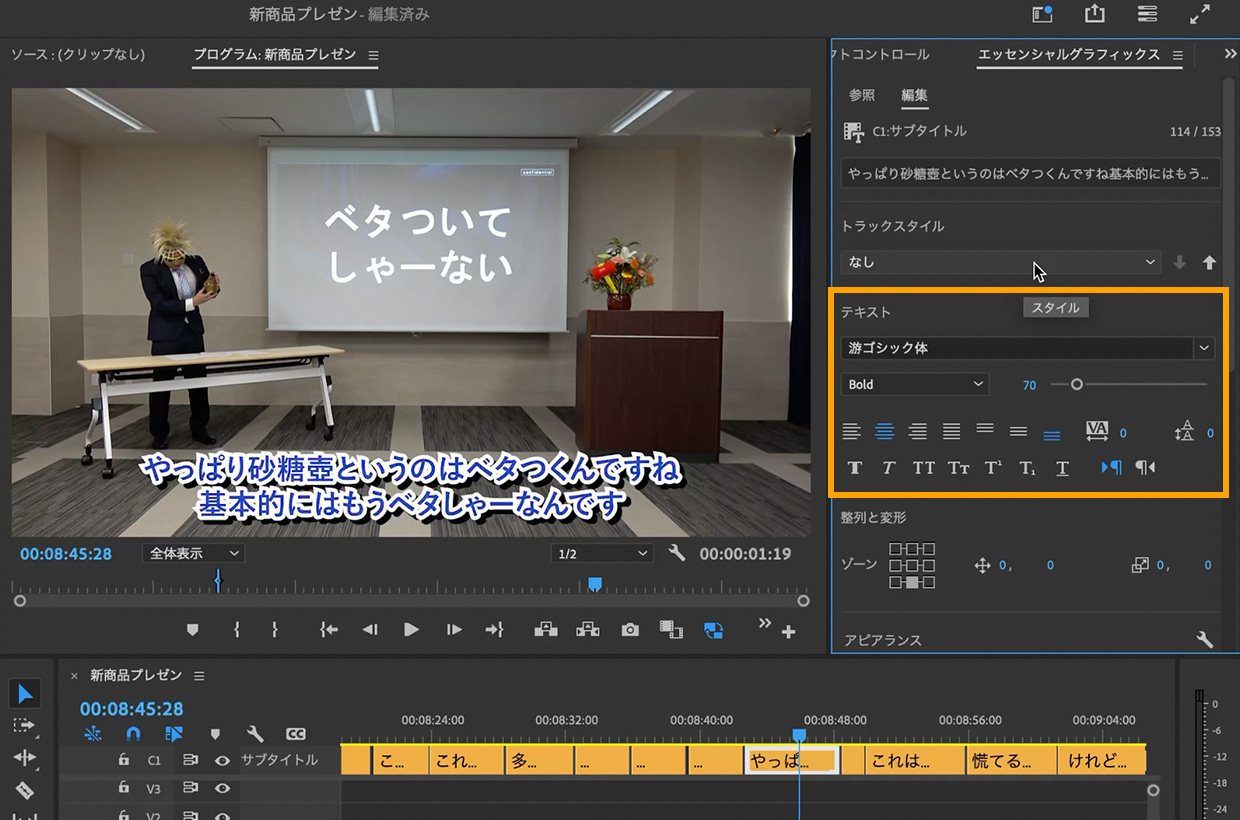 V3トラックのキャプションをすべて選択するとエッセンシャルグラフィックスパネルの編集タブが開きます。表示されていない場合は、ウィンドウ>ワークスペース>キャプションとグラフィックを選択します。フォントやサイズ、文字色(塗り)、境界線(縁取り)などを調整していきましょう。