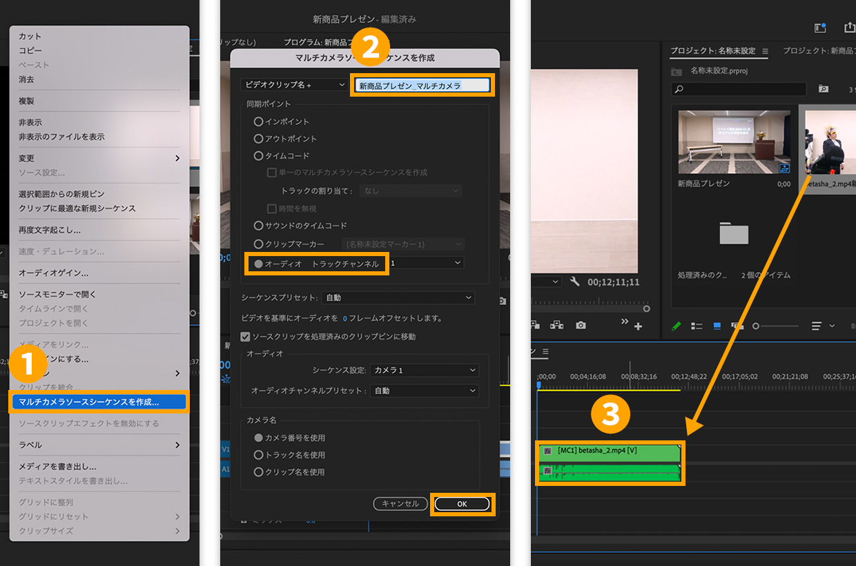異なるアングルの動画を一つの動画内で切り替えていくことで、より本格的な動画編集を楽しむことができます。①プロジェクトに追加した二つの動画を選び、右クリックから「マルチカメラソースシーケンスを作成」 を選択します。②任意のマルチカメラ名を入力。同期ポイントを「オーディオ」に変更し、OKをクリックします。③作成されたプロジェクトをV1トラックにドラックしましょう。