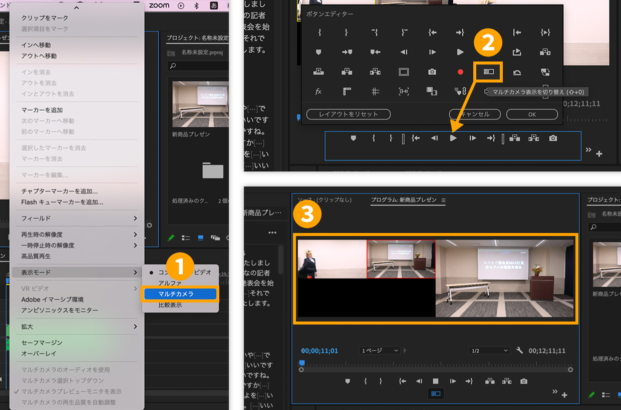 ①右クリックから、表示モード>マルチカメラを選択すると、二つの動画が左右に表示されます。②プログラムモニターの右下にある「+」から、「マルチカメラ表示を切り替え」をドラッグ&ドロップし、選択。③動画を再生し、任意のタイミングでどちらかのアングル選択をすることで、表示する映像を簡単に切り替えることができます。