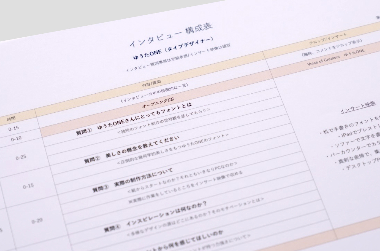 まずは「構成表」を作りましょう。作品の趣旨や、インタビュー内容、完成の設計図を事前に作っておくことがとても大切です。今回の参考映像となるインタビューでは文字をデザインするタイプアーティストの方が主人公になっています。いろいろな質問をどのように構成するかを事前にしっかりと決めておきます。もちろん、実際に撮影を行ってみて、構成が変更になることもあるかと思いますが、事前に準備しておけば、撮影をスムーズに進めることができます。書き方に特にルールはありませんが、質問の内容だけでなく、作品に入れるテロップや、時間の長さ、インタビューの質問リストなども作っておきましょう。