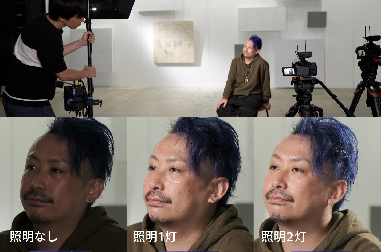 もちろん照明を上手に使えば、キレイに撮影を行えます。いろいろな照明機材が世の中出回っていますが、一番使いやすく、コストパフォーマンスがいいのがLEDの照明機材でしょう。もし予算的に少し余裕があれば、より明るいものや、色温度が変えられるものを選ぶといいです。また2灯以上あると、更にいろいろなライティングに挑戦できます。基本的に1灯の際は、顔を明るくするために使いますので、正面に置きます。ただ、顔に影を少し出して立体的にしたい場合には、斜めに置いてみるのもいいかもしれません。2灯ある際は、それに加えて、インタビューする人の後ろや斜め横などに置いてみるといいと思います。その人の顔のアウトラインが照明で作られて、より立体的な照明を作ることができます。
