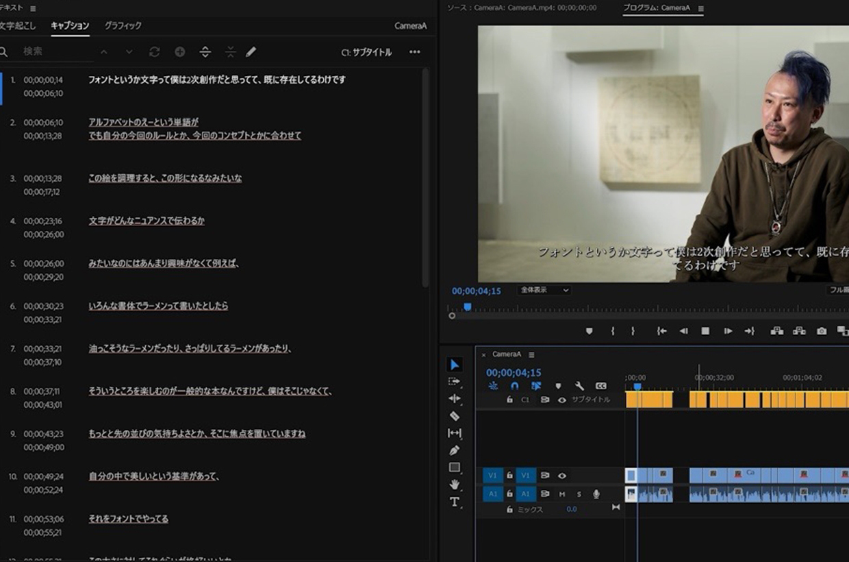 Premiere Pro の自動文字起こしの機能、そして進化した「文字起こしベースの編集」 を活用すれば、インタビュー動画の編集が格段に効率化します。動画素材を読み込む際に、自動で動画ファイル内の音声をテキスト化することができます。編集を始めるときにはすでに動画の文字起こしが終わっていて、必要なテキストを選ぶだけで該当の動画ファイルがシーケンスに自動で並んでいきます。テロップを画面に入れ込む作業も「キャプションの作成」ボタンで一発。フォントや文字の大きさなども、自分のスタイルに合わせて簡単に編集できます。この機能は一度試していただくとその便利さがわかります!今回撮影したサンプルのインタビュー素材を配布しているので、ぜひ動画を見ながら、実際に挑戦してみてください。