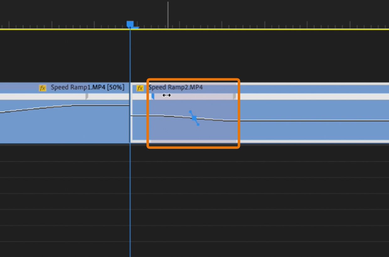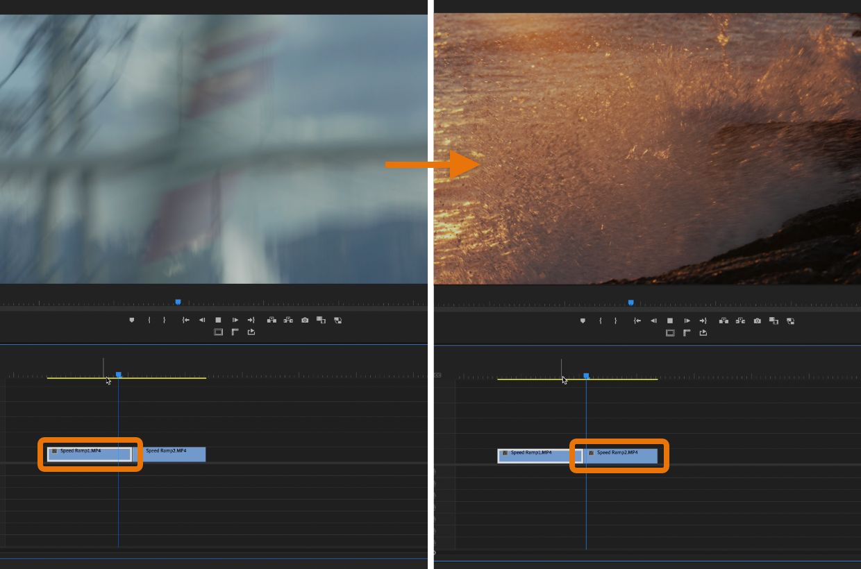 まずは「Speed Ramp1」と「Speed Ramp2」の2つの素材の切り替わりが違和感のないように繋げるための編集を行っていきましょう。