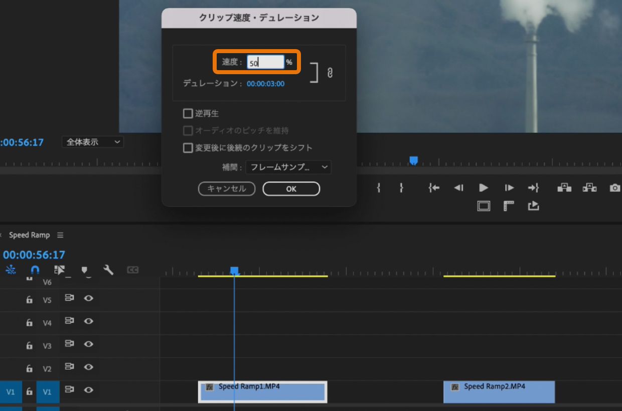 「Speed Ramp1」を選択し、「Mac:command+R」キーまたは「Win:ctrl+R」キーを押すと、「クリップ速度・デュレーション」が表示されます。速度の値を「100%」から「50%」へ変更します。これでスローモーションになります。