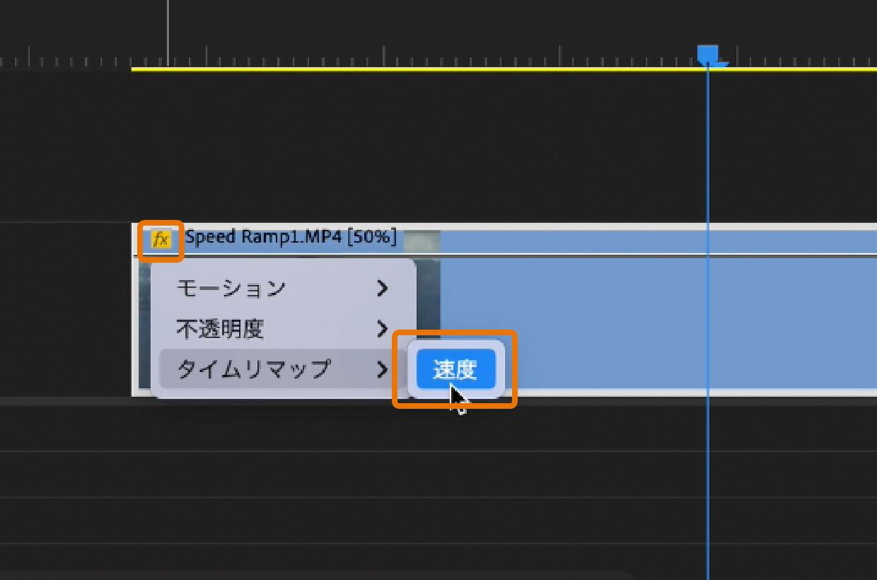 「Speed Ramp2」も同様に、「FX」を右クリックして、クリップキーフレームを表示→タイムリマップ→速度を選択し、クリップの速度を制御する水平の線を表示します。