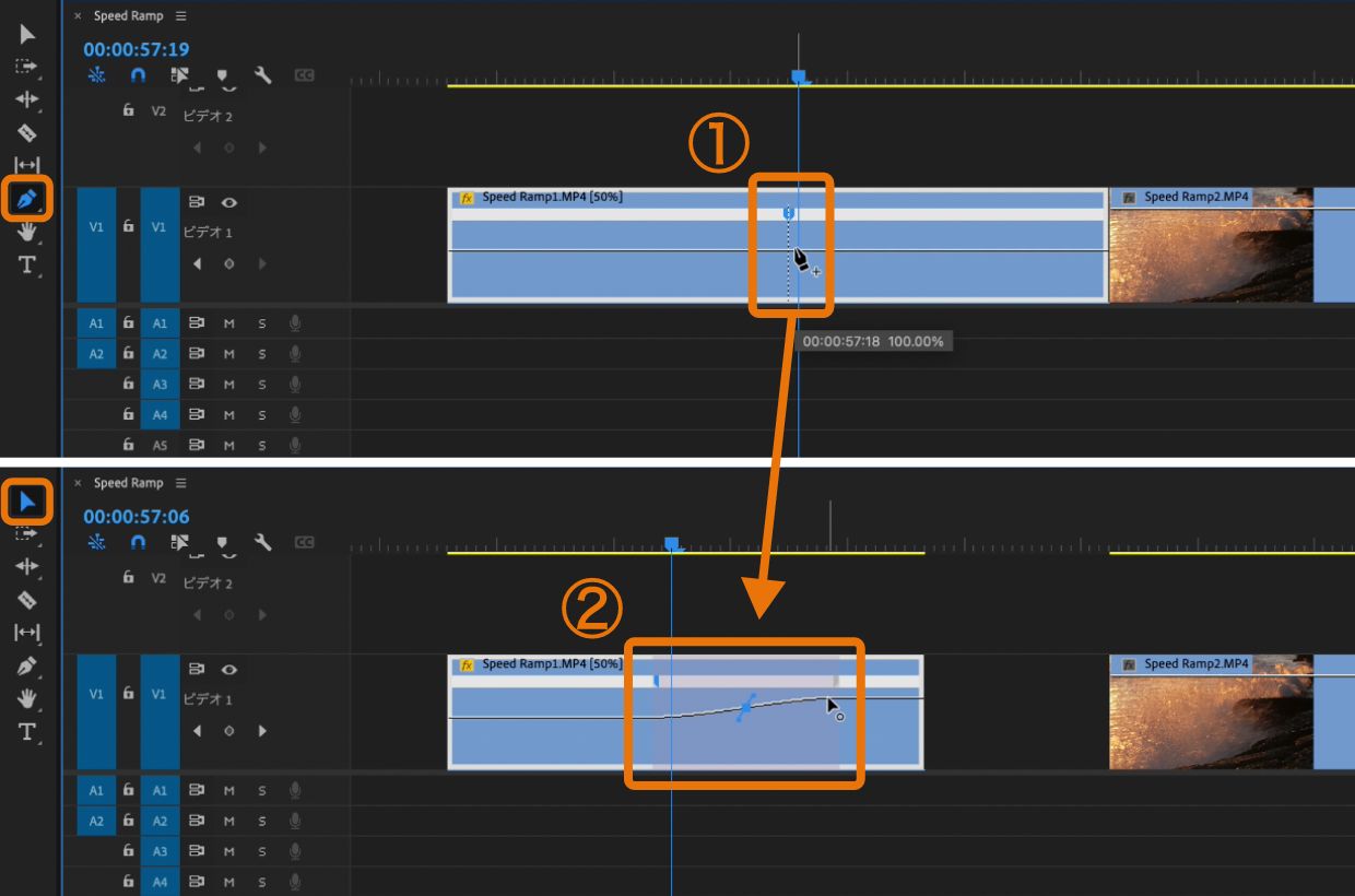 選択ツールに切り替えて、水平線を上に上げると、速度が早くなります。このままだと唐突に早くなるので、マークを付けた箇所を伸ばし、速度が徐々に早くなるようなめらかにします。