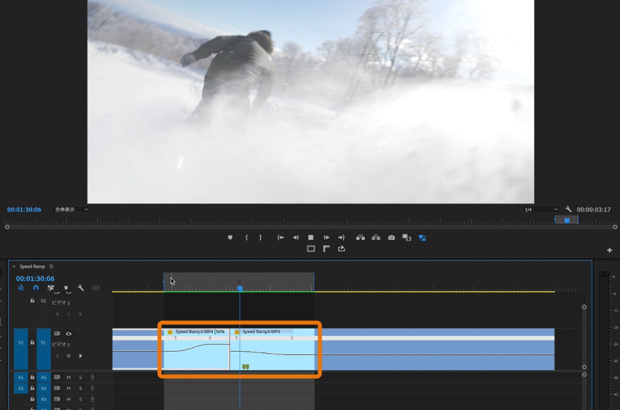 残りの「Speed Ramp3」と「Speed Ramp4」も同様に調整します。こちらでは、雪のパウダーが画面を覆うタイミングで繋げます。