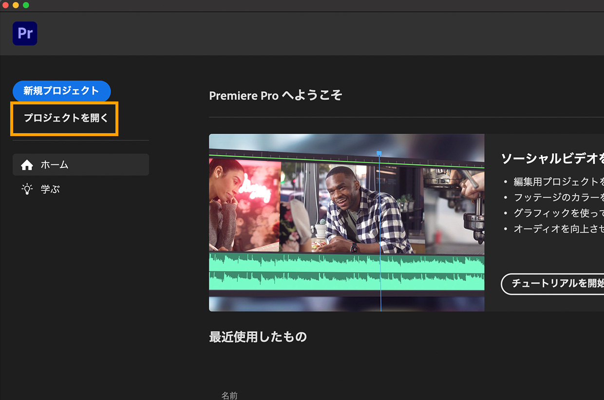 作業に入る前に、練習用サンプルファイルをダウンロードしておきましょう。スタート画面の「プロジェクトを開く」をクリックし、ダウンロードした練習用サンプルからプロジェクトファイルの方を選択して「開く」をクリックします。