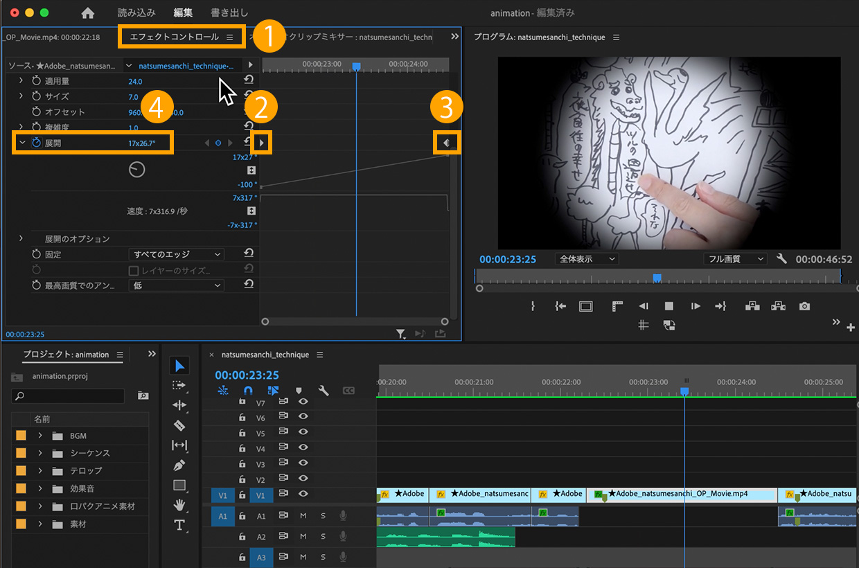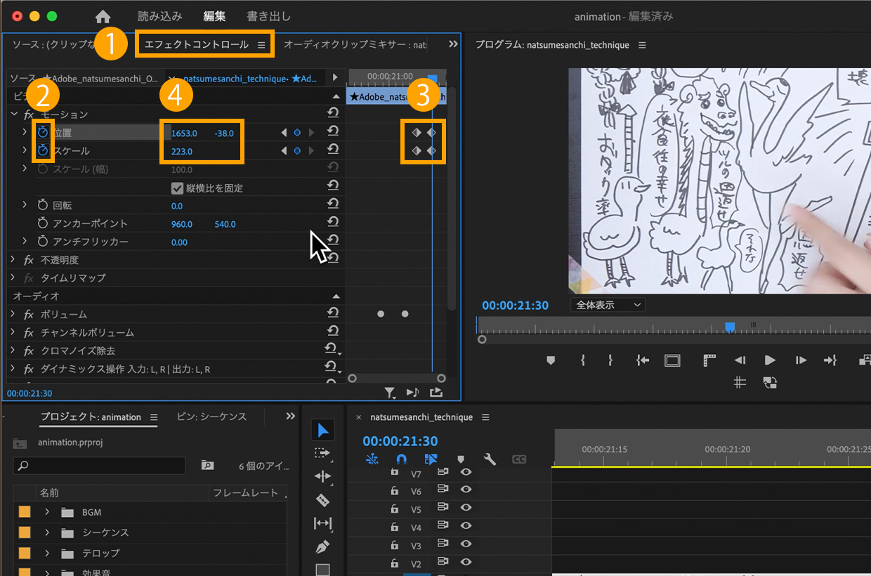 映像の中でも目立たせていきたいところを作っていきましょう。今回は「鶴の恩返せ」に素早くズームさせます。タイムラインパネルで再生ヘッドを、00:00:21:20に移動させ、①エフェクトコントロールパネル>モーションで②「位置」と「スケール」のストップウォッチマークをクリックしてキーフレームを打ちます。③00:00:21:30に再生フレームを動かし、④スケール:223%にして、位置は数値の上でドラッグし鶴のイラストが中央にくる位置に調整します。