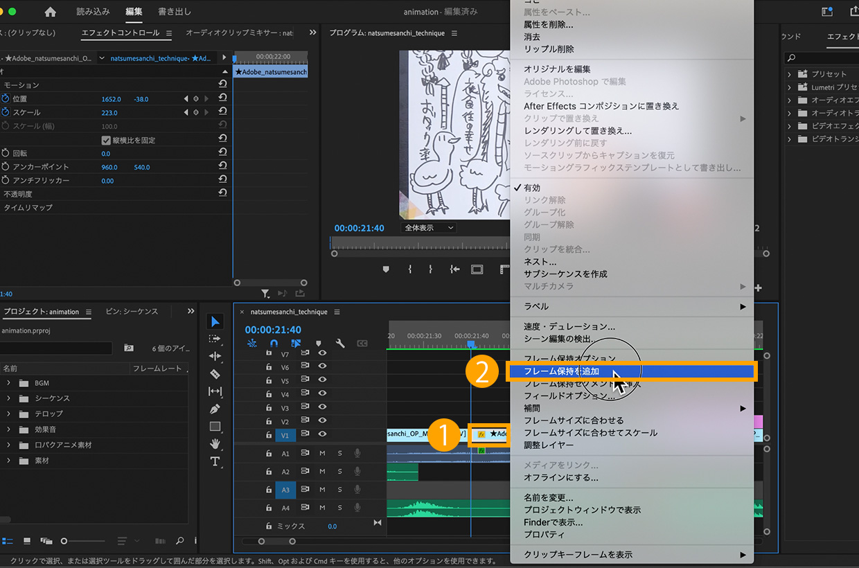 ツールパネル>レーザーツールを選択し、①00:00:21:40にカットします。カットした後ろのクリップを右クリックして②「フレーム保持を追加」をクリックします。これで静止画のように1つのフレームを保持することができます。