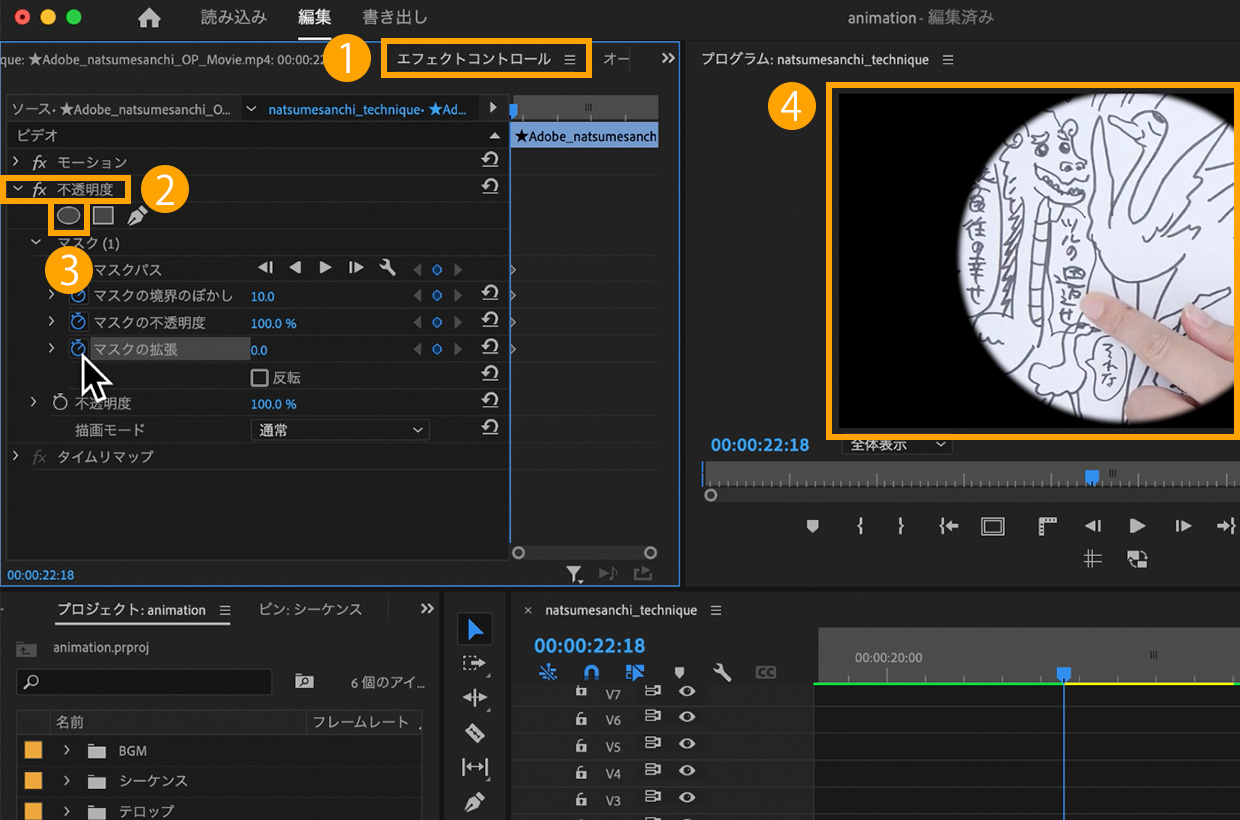 ツールパネル>レーザーツールで00:00:22:18にカットして、カットした後ろのクリップを選択します。①エフェクトコントロールパネル>②不透明度>③「楕円形マスクの作成」をクリック。④位置やサイズなどを調整しながら鶴の周りを黒くします。マスクの境界のぼかし:200に調整します。
