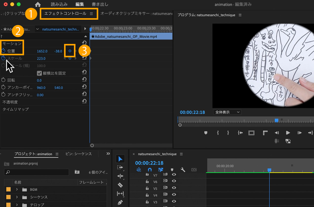 タイムラインパネルで再生ヘッドを、00:00:22:18に移動し、①エフェクトコントロールパネル>②モーション>「位置」のストップウォッチマークをクリックして、キーフレームを打ちます。タイムラインパネルで再生ヘッドを、00:00:24:26に移動します。③キーフレームの追加/削除をクリックし鶴をすこし右下に移動します。