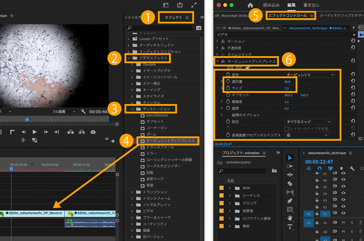 ①エフェクトパネル>②ビデオエフェクト>③ディストーション>④「タービュレントディスプレイス」を、鶴へドラッグ&ドロップします。⑤エフェクトコントロールパネル>⑥「タービュレントディスプレイス」の各数値を変更することで、波立つように歪みが繰り返されるコミカルなエフェクトをかけることができます。今回は適用量:24、サイズ:7に設定します。