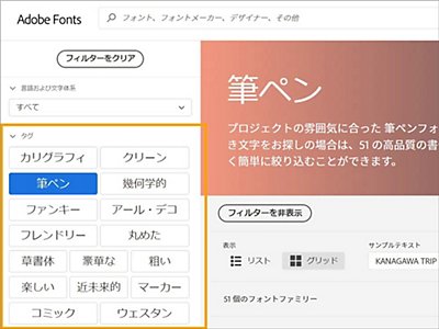ページ左部分、「タグ」をクリックすると、タグ付けされたジャンルごとにフォントを検索できます。ページ左部分の「分類」をクリックすると、「筆記体」や「手書き風」など、分類されたジャンルごとにフォントを検索できます。