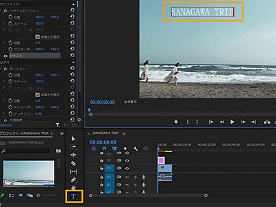 新規プロジェクトを作成して、ダウンロードしたファイル「KANAGAWA TRIP」を読み込み開きましょう。ツールパネルから「横書き文字ツール(Tのアイコン)」を選択して、タイトルの文字を入力します。ここでは「KANAGAWA TRIP」と入力してみましょう。