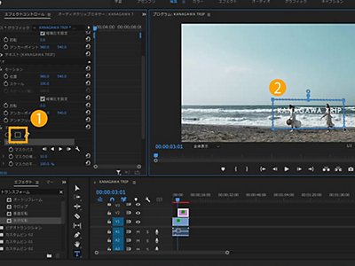 エフェクトコントロール、「不透明度」内にある長方形のアイコン「4点の長方形マスクの作成」をクリックします。プログラムモニターに長方形のマスクが出てくるので、 タイトルの文字全体を囲うように長方形の位置とサイズを合わせます。