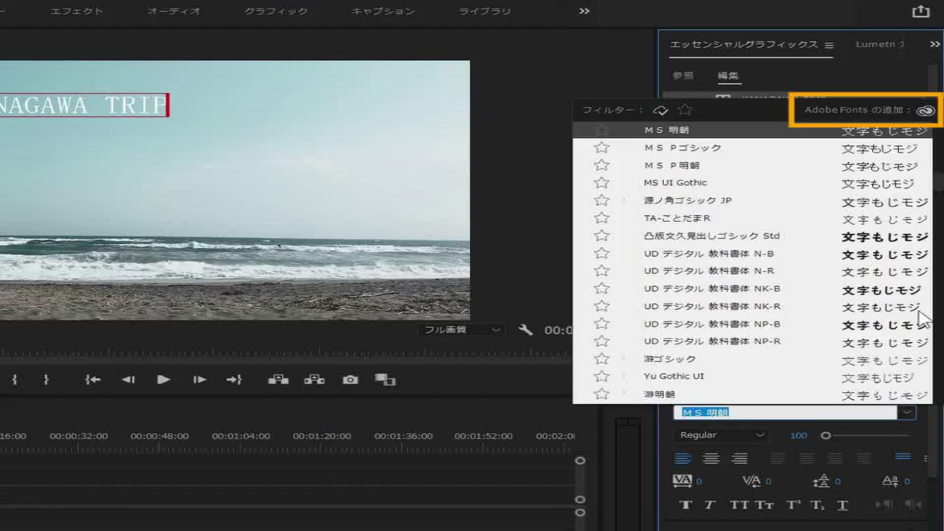 テキストのフォントタブをクリックし、上部右にある「Adobe Fontsの追加」のAdobe Creative Cloudのアイコンをクリックします。
