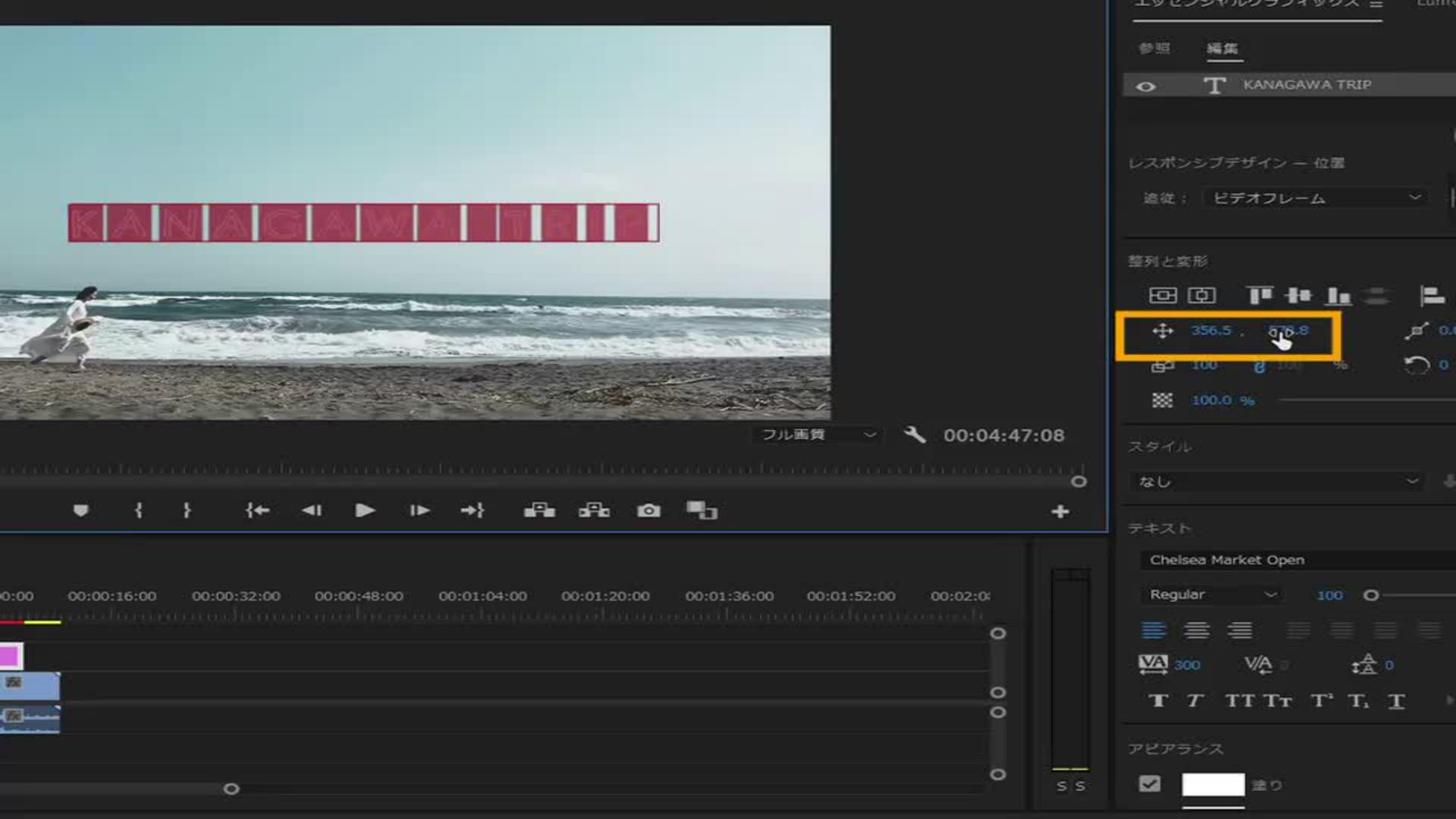 再生ヘッドの位置を後ろにずらし、「位置」の数字をタイトルが全て表示されるように動かします。そうするとキーフレームが打たれます。