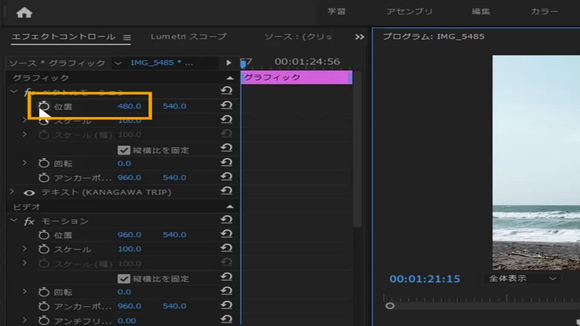 シーケンス内の再生ヘッドを、映像内のタイトルを出したい場面に移動させ、「エフェクトコントロールパネル>ベクトルモーション>位置」のストップウォッチのアイコンをクリックし、キーフレームを打ちます。