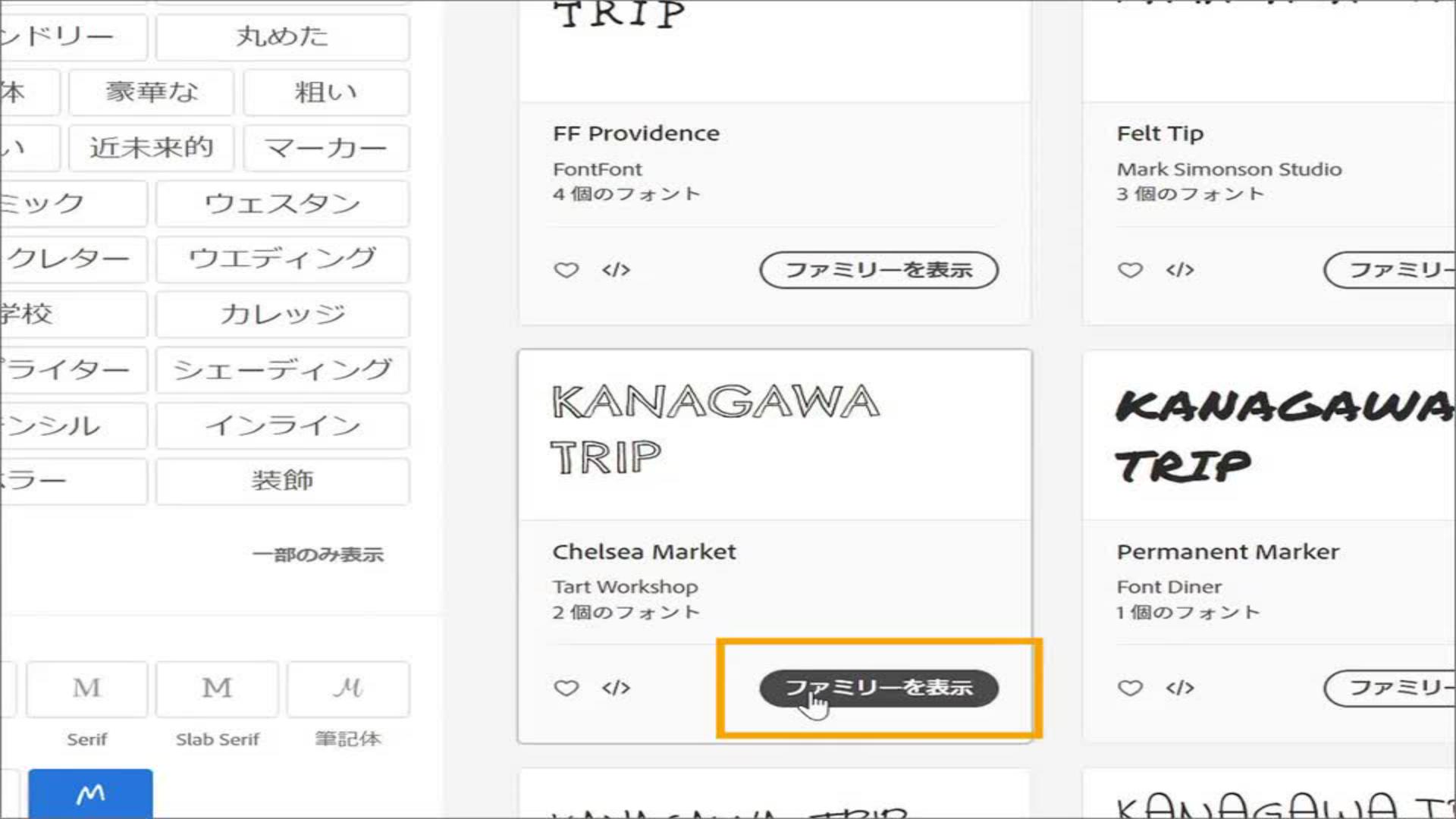 フォントをダウンロードするには、選んだフォントの「ファミリーを表示」をクリックします。