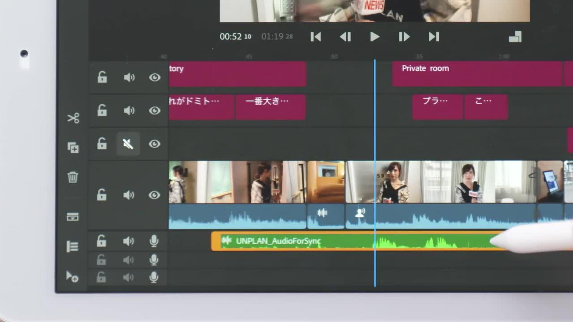 タブレットで収録した音声とは別に、ICレコーダーで収録した音声をタイムラインに追加して、2つの音声の波形を合わせるようにして映像と同期させます。