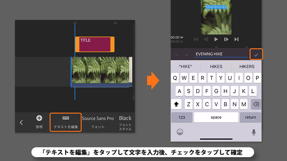 下部メニューから「テキストを編集」をタップします。文字を入力後、チェックをタップして確定します。