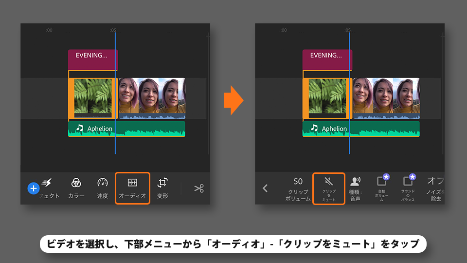 ビデオに収録されている音声をミュートします。ビデオを選択し、下部メニューから「オーディオ」-「クリップをミュート」をタップします。