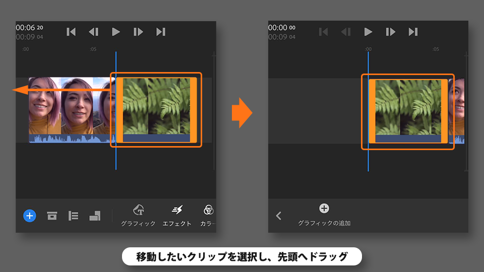 移動したいクリップをタップで選択し、先頭へドラッグします。