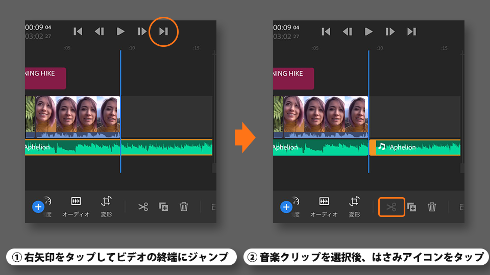 音楽クリップを選択後、はさみアイコンをタップして音楽をカットします。
