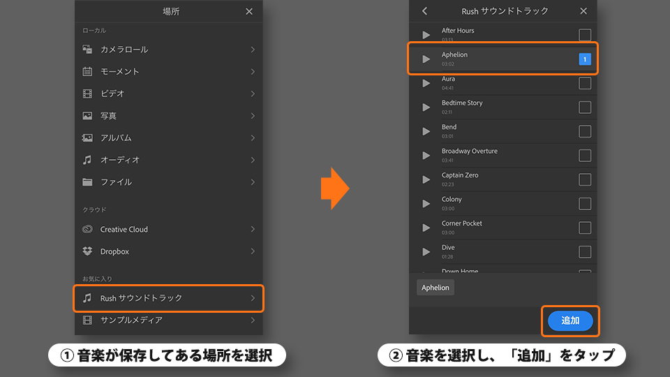 目的の音楽を選択し、「追加」をタップします。