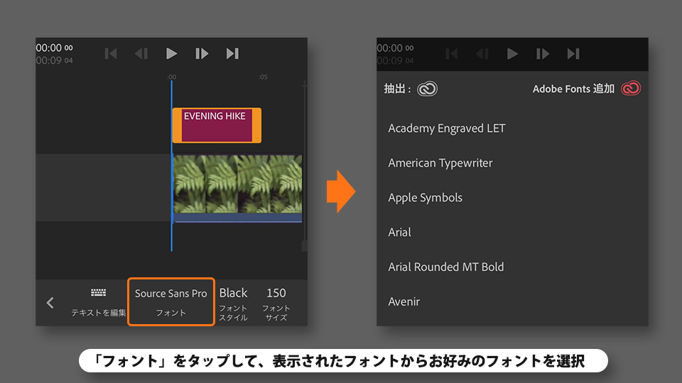 下部メニューから「フォント」をタップして、表示されたフォントからお好みのフォントを選択します。