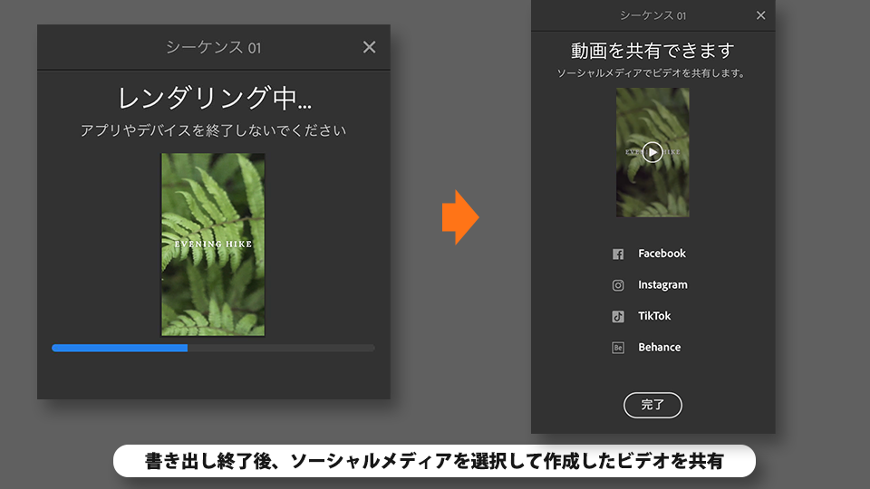 書き出し終了後、ソーシャルメディアを選択して作成したビデオを共有します。