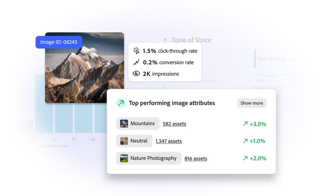 - 「Adobe Content Analytics」は、コンテンツのパフォーマンスを属性レベルで理解し、AIを活用してターゲットオーディエンスに響く正確な色、オブジェクト、スタイルを特定する機能を提供