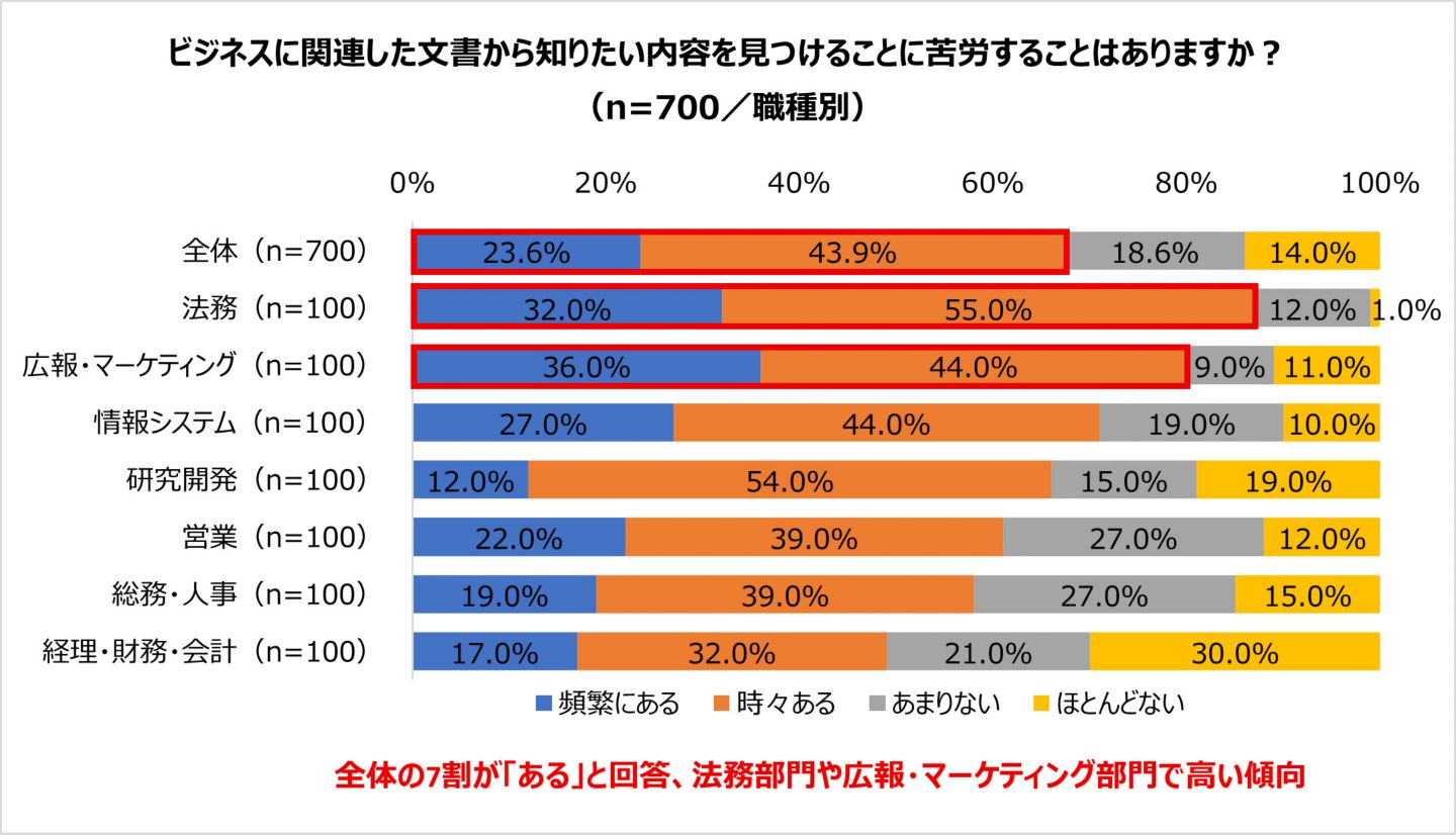 - 全体の7割がビジネス文書から情報を探すのに苦労していると回答。職種別では、法務部門が最多の9割に達し、全体平均を大きく上回る