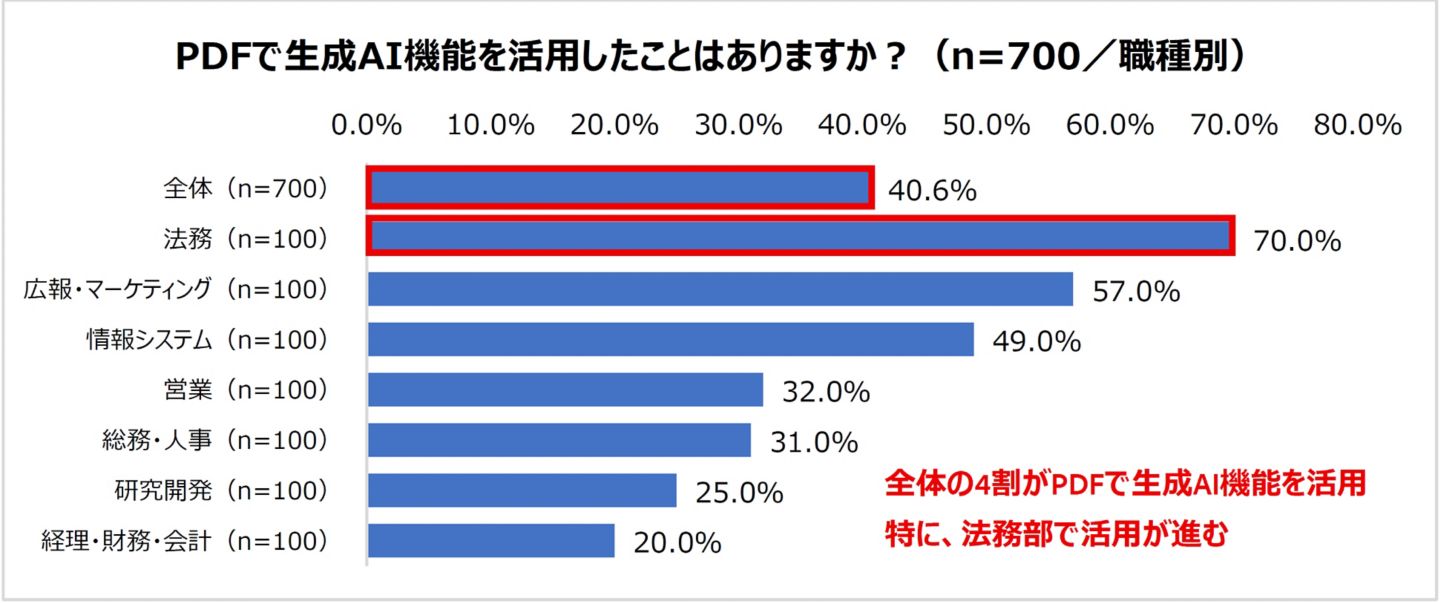 - PDFの「生成AI機能」利用率は全体の4割、利用ユーザーの8割が業務効率化を実感したと回答。職種別では法務部門の利用率が最多