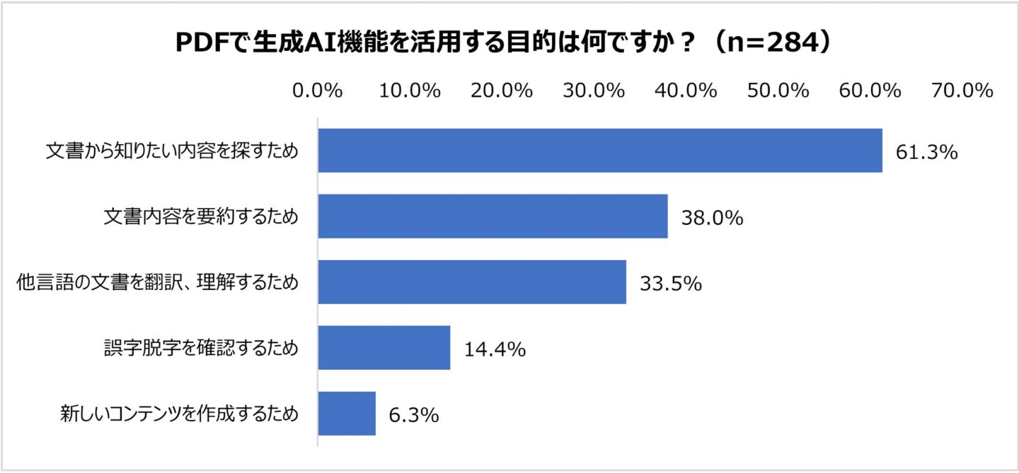 また、生成AI機能の活用目的としては、「文書から知りたい内容を探すため」が61.3%と最も多く、「文書内容を要約するため」が38.0%と続きました。