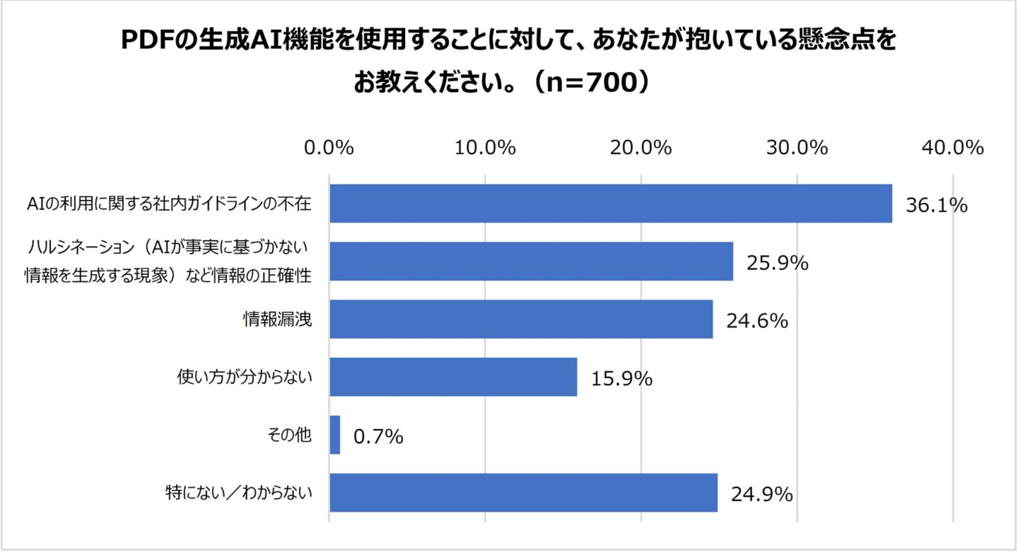 PDFの生成AI機能を使用することに対する懸念点について聞いたところ、全体の75.1%が何らかの懸念を抱えていると回答しました。具体的には「AIの利用に関する社内ガイドラインの不在(36.1%)」が最も多く、次いで「ハルシネーション(AIが事実に基づかない情報を生成する現象)など情報の正確性(25.9%)」、「情報漏洩(24.6%)」と続きました。