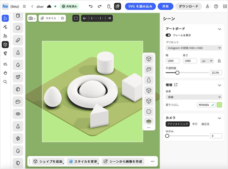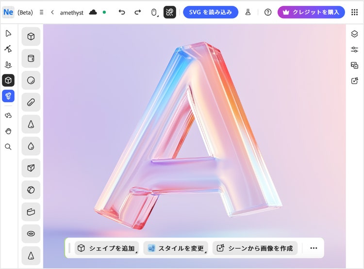 - Project Neo webアプリを開き、シェイプ作成などの馴染みのあるコンセプトを使って立体的なデザインを作成します。ベクターデザインの編集を開始するには、「SVGを読み込み」ボタンをクリックし、編集するIllustratorファイルを選択します。