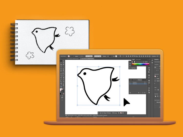 ラフなアイデアを紙にスケッチしてから、Adobe Illustratorにスキャンします。またはスマートフォンかiPadでスケッチして、それを取り込みましょう。