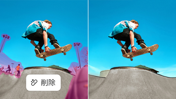 デスクトップでもiPadでもプロ仕様の写真編集ツールを使って、日常的な編集から本格的な加工まで手軽におこなえます。切り抜き、不要なオブジェクトの除去、複数写真の合成のほか、カラーや効果を調整しながら、撮った写真を見違えるような作品に仕上げましょう。