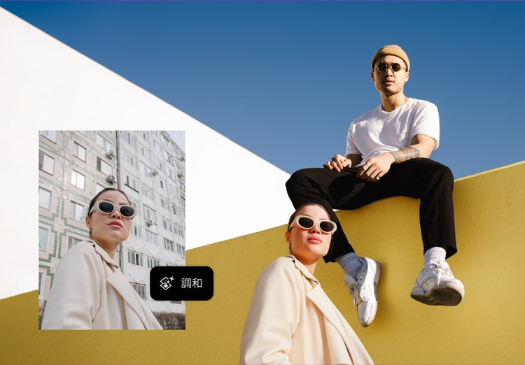 複数の画像を組み合わせる際、影、ライティング、トーンの統一が難しいことがあります。「調和」を使用すれば、AIでブレンドした統一感ある合成画像を簡単に作成し、製品カタログ、デジタルコラージュ、SNSキャンペーンに使用できます。