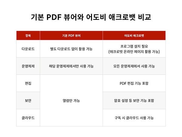 PDF 파일을 열람하기 위해서는 PDF 뷰어가 필요합니다. 높은 호환성이 특징인 PDF 파일은 기본 PDF 뷰어로도 문제없이 열람할 수 있지만, 애크로뱃을 사용하면 PDF 편집, PDF 보안 등 각종 고급 기능까지 활용할 수 있어 효율적인 문서 업무가 가능해집니다. PDF 뷰어 선택 기준과 운영 체제별 PDF 기본 프로그램 설정 방법을 살펴보세요.