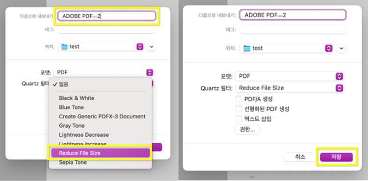 - 압축 파일 이름 설정 > Quartz 필터 팝업메뉴 선택 > [Reduce File Size] > [저장]